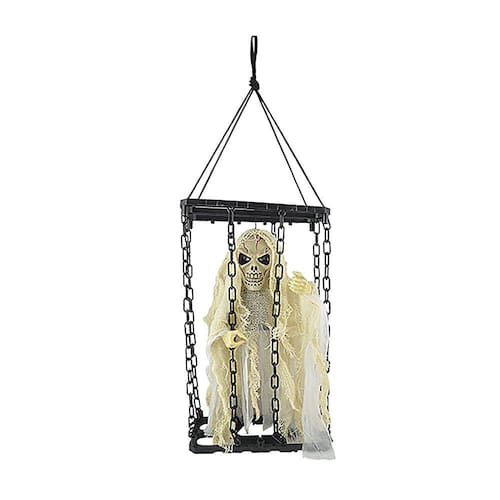 Fantasmas pendurados na gaiola Fantasmas brilhantes chamados de fantasmas de esqueleto Ornamentos decorativos Característica: Ativado por som e espancamento, até 19 5/8 de distância - de repente as pessoas assustadas gritam. O fantasma animado tremeu violentamente com a gaiola, com raiva, como se fosse escapar. Olhos vermelhos piscando no crânio e voz assustadora - criam uma atmosfera assustadora e assustadora, cordão conveniente e conveniente. O tamanho total é 40X23cm. Pessoas realistas e realistas assustam com efeitos inesperados, deixando uma impressão profunda; muito adequado para casas mal-assombradas, festas de Halloween, uso em pátio interno e externo. Conteúdo do Pacote: 1 x Gaiola pendurada fantasma