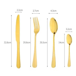 Kit de talheres com 24pçs Inox Dourado com Brilho e Suporte.Ideal para te acompanhar na rotina e receber seus convidados em casa. O kit é composto de 6 garfo, 6 faca e 6 colheres de sopa e 6 colheres sobremesa em aço inox dourado, e 1 suporte em aço inox cor (Dourado).Medidas ; Garfo 20cm x 2,4cm x 2mm / Faca 22cm x 2cm x 2mm / Colher Mesa 20cm x 4,4cm x 2mm.Colher Cha/Sobremesa 14cm x 3cm x 2mm. Suporte de talheres 24cm x 13cm x 15cm.Uma combinação de design, resistência e qualidade. Uma escolha certa para recusar os talheres descartáveis de forma prática e estilosa. Os talheres são composto e produzidas em aço inox com banho especial que proporciona acabamento impecável e uma excelente apresentação. Cada talher medi uma media de 20cm tamanho normal para refeiçoes tirando de sobremesa que e menor. Embalado em plastico bolha e caixa.Todas as informações divulgadas são de responsabilidade do Fabricante/Fornecedor.A garantia contra defeitos de fabricação,não cobre defeitos originados por mau uso.