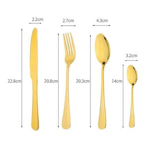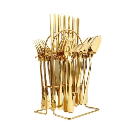 Kit de talheres com 24pçs Inox Dourado com Brilho e Suporte. Ideal para te acompanhar na rotina e receber seus convidados em casa. O kit é composto de 6 garfo, 6 faca e 6 colheres de sopa e 6 colheres sobremesa em aço inox dourado, e 1 suporte em aço inox cor Dourado . Medidas ; Garfo 20cm x 2,4cm x 2mm / Faca 22cm x 2cm x 2mm / Colher Mesa 20cm x 4,4cm x 2mm.Colher Cha/Sobremesa 14cm x 3cm x 2mm. Suporte de talheres 24cm x 13cm x 15cm. Uma combinação de design, resistência e qualidade. Uma escolha certa para recusar os talheres descartáveis de forma prática e estilosa. Os talheres são composto e produzidas em aço inox com banho especial que proporciona acabamento impecável e uma excelente apresentação. Cada talher medi uma media de 20cm tamanho normal para refeiçoes tirando de sobremesa que e menor. Embalado em plastico bolha e caixa. Todas as informações divulgadas são de responsabilidade do Fabricante/Fornecedor. A contra defeitos de fabricação,não cobre defeitos originados por mau uso. Marca: Não Informado