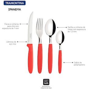 Com um design prático e moderno, os talheres desse conjunto são perfeitos para complementar a decoração de sua mesa! Com ele, seus almoços e jantares ficarão muito mais atraentes, atiçando o paladar e deixando qualquer receita mais saborosa! O Faqueiro Ipanema conta com a qualidade já reconhecida da Tramontina, pois as lâminas em aço inox das facas possuem maior durabilidade do fio devido ao tratamento térmico, e os garfos e colheres contam com maior espessura e uma estampagem do aço que garante maior resistência, evitando deformações. Além disso, os cabos em Polipropileno são super resistentes e possuem um desenho especialmente pensado para garantir conforto no manuseio, encaixando perfeitamente nas mãos.