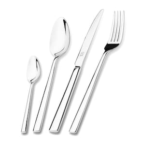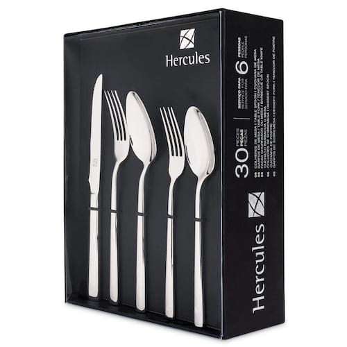 Faqueiro 30 Peças de Aço Inox com Estojo de Papelão Hercules MykonosA sofisticação Hercules pode chegar até sua mesa com o novo Faqueiro Mykonos. Acompanha utensílios indispensáveis para ajudar você a servir seus convidados com um toque ainda mais especial. Os Talheres possuem acabamento em Aço Inox 18/10. Talheres que garantem maior durabilidade no fio de corte, e por suas características de temperabilidade, não riscam as porcelanas. Acabamento em alto brilho e design contemporâneo. Com Lâmina temperada, ergonômico, cabos maciços e acabamentos entre os dentes. Podem ser lavadas diariamente na máquina de lavar louçasContém: 6 Colheres de Mesa / 6 Garfos de Mesa / 6 Facas de Mesa / 6 Colheres de Sobremesa / 6 Garfos de SobremesaCor: PrataMaterial: Aço inoxMedidas da embalagem: 28cm Comp. X 8cm Alt. X 22cm Larg.Peso: 2,56kg