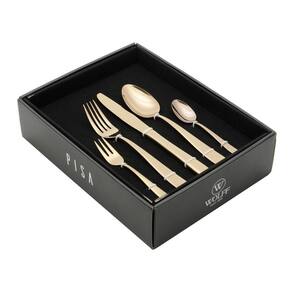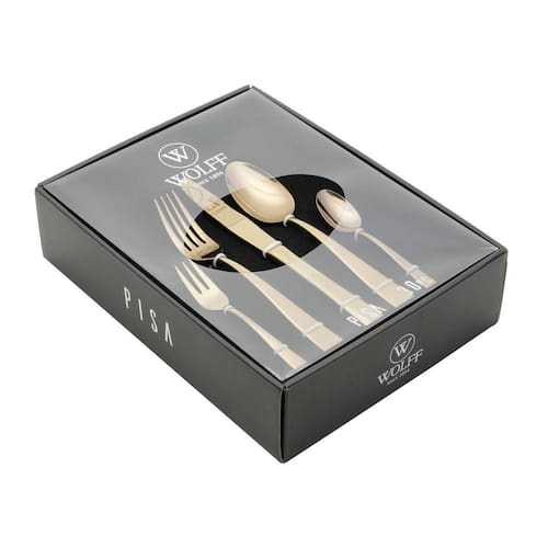Faqueiro 30 peças Aço Inox Pisa Dourado - Wolff Os talheres são indispensáveis para a composição de uma mesa perfeita, proporcionam o encontro entre o sofisticado e o moderno. Design clean e acabamentos detalhados, com uma imensa variedade de estilos, desde os mais tradicionais aos mais contemporâneos, trazendo à mesa luxo e requinte.Material: Aço Inox Peças: 30Marca: Wolff