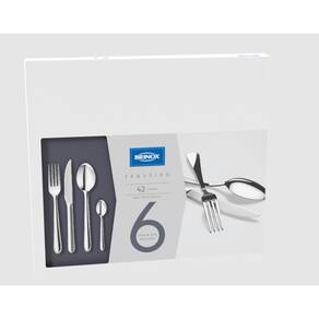 O jogo de talheres serve 6 pessoas com 6 colheres de mesa, 6 garfos de mesa, 6 facas de churrasco, 6 colheres de sobremesa, 6 garfos de sobremesa, 6 colheres de chá e 6 colheres de café.
