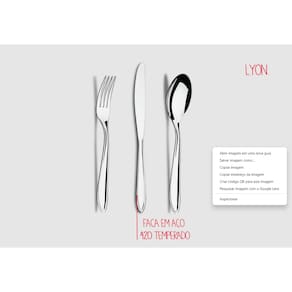 O faqueiro Lyon é feito em aço inoxidável que confere maior firmeza ao produto aumentando sua durabilidade. Vendida em uma embalagem de papel perfeita para presentear.