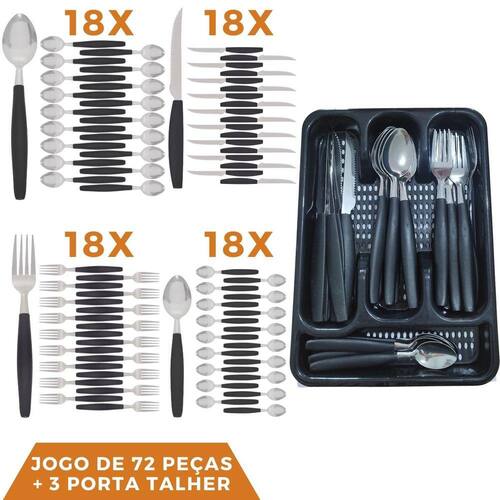 Conj de talheres + porta talher O Conjunto de talheres com porta talher é um conjunto de utensílios de mesa composto por talheres básicos, como garfos, facas, colheres e colheres de chá, acompanhados de um prático porta talheres para armazenamento e transporte conveniente. Esse conjunto é ideal para uso em casa, em viagens, acampamentos, piqueniques e outras ocasiões em que seja necessário levar os talheres consigo. Os talheres são compostos por aço inoxidável de alta qualidade e um porta talher feito de plástico durável. Os talheres são fabricados em aço inoxidável, um material conhecido por sua resistência à corrosão e durabilidade. Eles são projetados para serem resistentes e duráveis, permitindo o uso contínuo sem enferrujar ou corroer, mesmo com o contato frequente com alimentos e água.