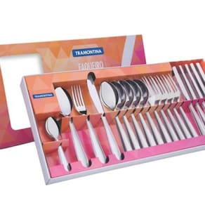 66906/840ConteúdoTalheres de aço inox. 06 un - Garfo de mesa06 un - Faca para churrasco06 un - Colher de mesa06 un - Colher para cháOrientações GeraisUse apenas sabão ou detergente e uma esponja macia. Outros tipos de produtos, como palha de aço, poderão riscar ou prejudicar o brilho dos talheres. Enxágue bem cada peça a fim de remover totalmente os resíduos dos produtos de limpeza, que, por serem abrasivos, podem atacar o inox. Sempre que possível, use água quente, pois renova o brilho do talher. Após a lavagem, enxugue imediatamente os talheres, caso contrário, as substâncias químicas da água (cloro) poderão causar manchas. Evite atrito entre os talheres durante o processo de lavagem e no armazenamento, para mantê-los sem riscos. Evite o contato das peças com superfícies quentes. Elas provocam a descoloração do produto. Não guarde os talheres em locais úmidos. A umidade também provoca manchas.Qualquer faca, independentemente de marca, para manter o fio de corte, é fabricada em aço com maior teor de carbono e, por isso, é menos resistente à corrosão. Assim, pedimos uma atenção especial para este artigo, pois estará mais propenso aos problemas citados. Usando máquina de lavar louças Não carregue em demasia a cesta dos talheres. Separe bem as peças, pois o contato permanente entre as mesmas, durante a secagem, poderá causar manchas. Retire os talheres logo que tenha terminado o ciclo"enxaguar", a fim de que os mesmos sejam secados manualmente.Benefícios do Produto1. As peças são acondicionadas em uma bela embalagem. 2. Totalmente feitas de aço inox, altamente duráveis, mantêm suas características originais, preservando a beleza, a higiene e a durabilidade do material. 3. Colheres com bojo em formato simétrico ebordas cuidadosamente arredondadas. 4. Garfos com dentes polidos na parte interna, com formato apropriado para a boca e bordas arredondadas para proporcionar maior conforto no uso. 5. Facas totalmente temperadas, que garantem maior durabilidade no fio de corte e maior resistência à corrosão, e por suas características de temperabilidade, não riscam as porcelanas. 6. Acabamento em alto brilho. 7. Serviço para 06 pessoas. 8. Podem ser lavadas diariamente na máquina de lavar louças.