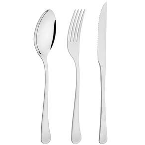 Informações técnicas: - Peças totalmente feitas de aço inox, altamente duráveis, mantêm suas características autênticos, preservando a beleza, a higiene e a durabilidade do material; - Colheres com bojo em formato simétrico e bordas cuidadosamente arredondadas; - Garfos com dentes polidos na parte interna, com formato apropriado para a boca e bordas arredondadas para proporcionar maior conforto no uso; - Facas totalmente temperadas, que garantem maior durabilidade no fio de corte e maior resistência à corrosão, e por suas características de temperabilidade, não riscam as porcelanas; - Acabamento em brilho; - Próprias para uso diário combinam com qualquer ambiente; - Podem ser lavadas diariamente na máquina de lavar louças. - Podem ir à máquina de lavar louças facilitando seu dia a dia;