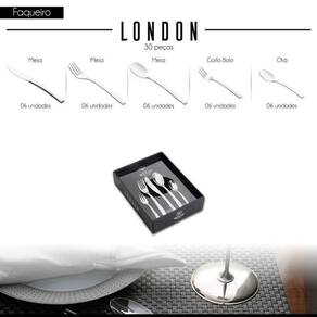 Ideal para as refeições diárias, o Faqueiro Wolff London é feito em aço inoxidável resistente e duradouro. Tem um design requintado com acabamento em alto brilho que tornam a ocasião ainda mais requintada. Faqueiro de uso diario, para quem não quer abrir mão da qualidade e requinte. Produtos especiais para servir em grande estilo Altura: 7,5cm Largura: 28,5cm Profundidade: 21,5cm Material: Aço Inox Cor: Prata Número de Itens: 30 Conteúdo Caixa contendo: 06 unidades de colheres, 06 unidades de Garfos, 06 unidades de facas, 06 unidades de garfos para Bolo e 06 unidades de colheres de chá.