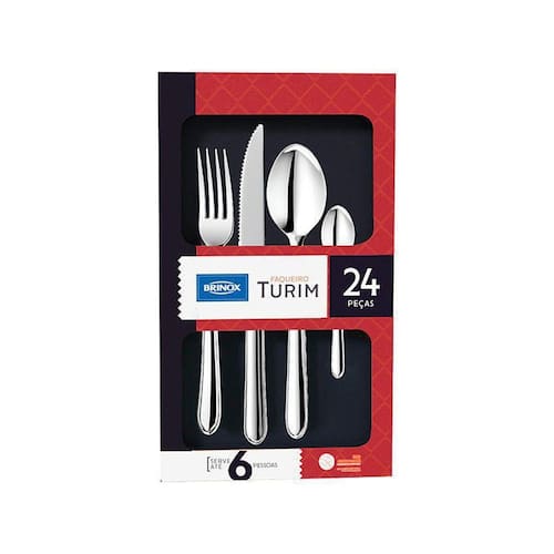Faqueiro Brinox Inox Turim 5111/142 - 24 Peças A Linha Turim é uma aliada no dia a dia. Os talheres proporcionam resistência, segurança e garantem uma rotina eficiente. Os talheres são feitos de aço inox com acabamento polido, e os cabos apresentam um friso que é marca da linha. Este faqueiro de 24 peças contém talheres para servir uma refeição para seis pessoas: colheres e garfos de mesa, facas de churrasco e colheres de chá. Todos os utensílios podem ir à lava-louças. Acabamento vibrado Facas com polimento extra brilho Espessura: 2 mm da faca Espessura: 1,2 mm do garfo e colher ESPECIFICAÇÕES Material Aço Inox Linha Turim Composição 01 Faqueiro 24 peças, compacto - Turim Garantia 90 dias para vícios ou defeitos de fabricação.