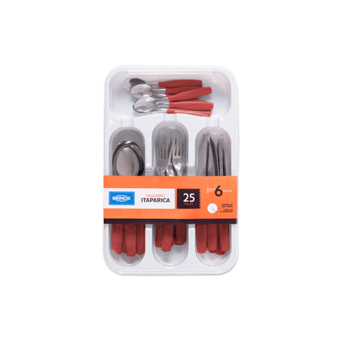 Colorida e informal, a linha Itaparica é perfeita para alegrar a sua mesa no dia a dia sem perder em qualidade e beleza. Feitas de aço inox polido e cabo em polipropileno, as peçam podem ir à máquina de lavar. As facas são temperadas, não danificando pratos de porcelana. Este faqueiro de 25 peças serve refeições para até seis pessoas, contendo garfos e colheres de mesa, facas de churrasco, garfos, colheres de chá e 1 gaveteiro. Para combinar com a decoração da sua cozinha, o conjunto está disponível em cinco cores: preto, azul fog, branco, cinza e vermelho bold.