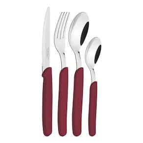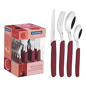 Com lâminas em aço inox e cabos de polipropileno na cor vermelho carmín escuro, o faqueiro conta com 24 peças, ele irá garantir a beleza da sua mesa, além de levar mais alegria para todas as ocasiões.