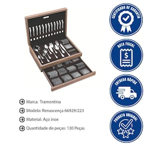 - Faça da sua mesa um ambiente ainda mais sofisticado com o incrível Faqueiro Tramontina em Aço Inox com Facas de Mesa Acabamento Brilho e Fosco com Detalhes em Alto Relevo no Cabo e Estojo de Madeira 130 Peças da linha Renascença.