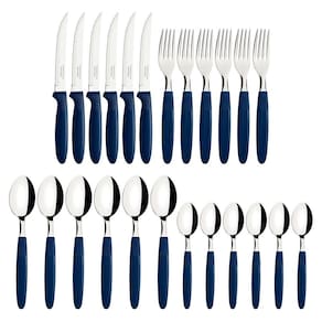 Um faqueiro com garfos, facas e colheres para servir da entrada à sobremesa, que tem peças produzidas com lâminas em aço inox com espessura e formatos diferenciados que garantem maior durabilidade e resistência.