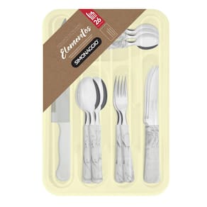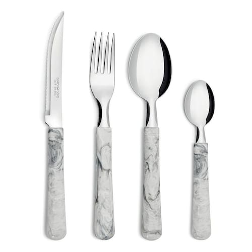 Faqueiro com separador elementos madre pérola 26 peças Produzido em aço inox com cabos de plástico e naturalmente exclusiva, a linha elementos cria padrões e texturas que nunca se repetem. Dos mármores claros aos tons terrosos e avermelhados, tem suas estampas inspiradas nos elementos da natureza. Contém: 6 facas de carne / 6 garfos de mesa / 6 colheres de mesa / 6 colheres para sobremesa / 1 faca para cozinha / 1 separador plástico com tampa Cor: Madre Pérola Material: Aço Inox Medidas da embalagem: 44cm comp. X 5cm alt. X 34cm larg. Peso: 0,940kg