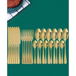 Um faqueiro dourado com 32 peças, ideal para servir até 8 pessoas. Ele possui um design robusto, com linhas retas e detalhes nas pontas dos cabos dos talheres que irá deixar a sua mesa ainda mais sofisticada. Os talheres dourados são fortes e resistentes e o revestimento é com alto padrão de qualidade e durabilidade.