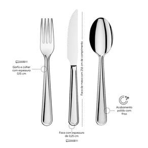 O faqueiro serve 12 pessoas e é composto por: Colher e garfo de mesa, faca de churrasco, colher e garfo de sobremesa, e colheres de café. Produzidos no Brasil, os talheres garante qualidade e durabilidade por muito mais tempo. Talheres com polimento extra brilho, as colheres de chá e café possuem acabamento vibrado além de espessura de 2,5 mm na faca e de 1,2 mm no garfo e colher.