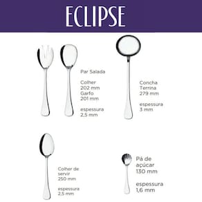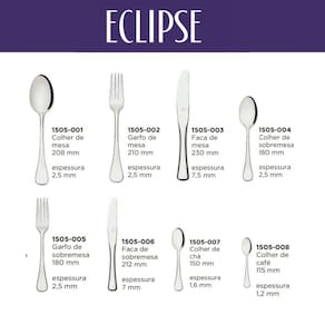 Faqueiro Hercules Aço Inox Eclipse 101 Peças Com Estojo Gift Box Descrição: A linha Hercules Eclipse eleva o requinte das suas refeições com design sofisticado e funcional. Produzido em aço inox, apresenta cabos chanfrados, pontas arredondadas e polimento entre os dentes para maior durabilidade. Perfeito para ocasiões especiais e uso diário, com estojo gift box que garante organização e apresentação premium. Os talheres Hercules seguem um rigoroso padrão de qualidade, com produtos para todas as ocasiões e necessidades, sendo reconhecida nacionalmente e internacionalmente Venha conhecer a linha completa de talheres Eclipse Hercules Características: - Aço inoxidável; - Aço Inox 18/0; - Acabamento Premium com alto Brilho; - Ergonômico; - Lamina Forjada e Temperada; - Polimento entre os dentes; - Pontas Perfurante; - Monobloco, obtidas de uma única peça, sem emendas; - Design Exclusivo e Sofisticado; - Pode ir a Lava Louças; Composição: -1 Estojo Gift Box -12 colheres de mesa: 20 cm e espessura 2,5 mm -12 garfos de mesa: 20 cm e espessura 2,5 mm -12 facas de mesa: 23 cm e espessura 7 mm -12 colheres de sobremesa: 16,5 cm e espessura 2,4 mm -12 garfos de sobremesa: 16,5 cm e espessura 2,4 mm -12 facas de sobremesa: 20 cm e espessura 6,5 mm -12 colheres de chá: 13 cm e espessura 1,8 mm -12 colheres de café: 10 cm e espessura 1,8 mm -1 colher de salada: 20 cm e espessura 2,5 mm -1 garfo de salada: 20 cm e espessura 2,5 mm -1 concha terrina: 28 cm e espessura 3 mm -1 colher para servir: 25 cm e espessura 2,5 mm -1 pá de açúcar: 13 cm e espessura 1,6 mm Especificações: Marca: Hércules; : 3 meses; ---- Aqui na Casa & Tendência você encontra os melhores utensílios domésticos e tudo que você precisa para sua cozinha ---- Marca: Não Informado Ean: 7891060054057