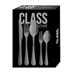 - Marca: Class Home - Material: Aço Inox Conteúdo: - 6 seis facas mesa 23cm - 6 seis garfos mesa 20cm - 6 seis colheres mesa 20cm - 6 seis colheres sobremesa 18cm - 6 seis garfos sobremesa 17cm Total: 30 trinta peças.