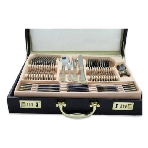 Faqueiro Inox 84 Peças Banhando Ouro 24k Faqueiro 84 peças em aço inoxidável 18/10 3.0mm de espessura com filetes banhado A ouro 24k, design exclusivoproduto novo, com garantia E nota FISCALUm bom faqueiro leva charme, elegância e bom gosto para a composição da sua mesa. Produzido em aço inox, ricamente adornado e exclusivo. Apresentam espessura de 3mm e acabamento espelhado. Maleta de armazenamento produzida em couro ecológico, com fechamento por sistema de senha. O produto POSSUI:12 Colheres12 Garfos principais12 Facas principais12 Garfos sobremesa12 Colheres sobremesa12 colheres café01 Espátula pata bolo02 Garfos peixe01 Concha grande01 Concha pequena01 Colher açucareiro01 Pegador02 Colheres para servir02 Colheres de saladaINSTRUÇÕES de abertura da maleta: - insira a senha: 0000- afaste as travas para os lados Marca: Nakazaki