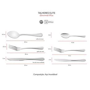 Faqueiro com talheres de mesa, salada, sobremesa e espatula em aço inoxidavel. A linha de Talheres Elite da Gourmet Mix possui design atual, com linhas arredondadas sem detalhes nos cabos, com maior espessura e acabamento em alto brilho, o que da aos talheres uma aparencia leve e sofisticada. Sao produzidos totalmente em aço inox de qualidade, garantindo a durabilidade, beleza e higiene.