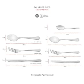 Faqueiro com talheres de mesa, salada, sobremesa e espatula em aço inoxidavel. A linha de Talheres Elite da Gourmet Mix possui design atual, com linhas arredondadas sem detalhes nos cabos, com maior espessura e acabamento em alto brilho, o que da aos talheres uma aparencia leve e sofisticada. Sao produzidos totalmente em aço inox de qualidade, garantindo a durabilidade, beleza e higiene.