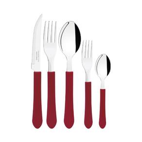 Informações adicionais: Ean: 5717544567412 Validade: indeterminada Conteudo: 4 - facas para churrasco 4'' 4 - garfos de mesa 4 - colheres de sopa 4 - garfos para sobremesa 4 - colheres para chá Tamanho aproximado do pote: a:23,5xl:9,5cm Peso aproximado: 455g Tipo de produto: conjunto de talheres / faqueiro com 20 pecas leme no pote Cor: prata com cabo vermelho Composição: inox e plastico