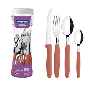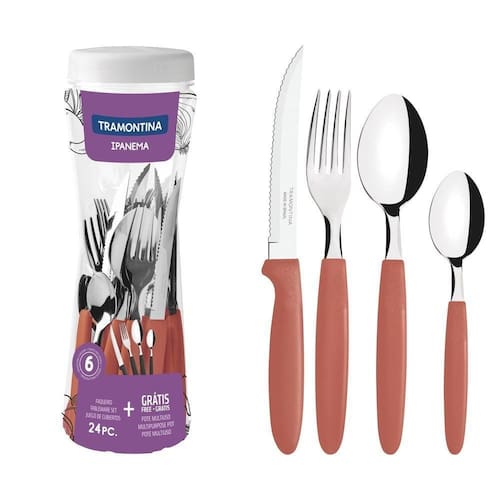 Faqueiro Tramontina Ipanema Com Lâminas Em Aço Inox E Cabos De Polipropileno Goiaba Com Pote Plástic Tramontina Faqueiro Tramontina Ipanema com Lâminas em Aço Inox e Cabos de Polipropileno Goiaba com Pote Plástico 24 Peças Tramontina - Deixe suas refeições ainda mais convidativas e alegres com o Faqueiro Tramontina Ipanema com Lâminas em Aço Inox e Cabos de Polipropileno Goiaba com Pote Plástico 24 Peças! Ele tem peças com lâminas produzidas em aço inox e cabos em polipropileno na cor goiaba, ambas características que proporcionam maior durabilidade e resistência, além de deixar sua mesa ainda mais bonita e colorida. Ele é ainda muito fácil de limpar e pode ser lavado na máquina de lavar louças, além de acompanhar um pote plástico ideal para armazenar e guardar suas peças ou alimentos!OrientaçõesLâminas de aço inox. As lâminas das facas têm maior durabilidade do fio devido ao tratamento térmico. Os garfos e colheres garantem maior resistência devido a espessura do aço e a estampagem das lâminas. Os cabos de polipropileno possuem maior resistência e durabilidade. Podem ir à máquina de lavar louças facilitando seu dia a dia.ObservaçõesAntes da primeira utilização, lave bem as peças e seque-as. Tenha cuidado ao manusear produtos cortantes e perfurantes e mantenha-os fora do alcance das crianças. Para maior durabilidade dos produtos recomenda-se secar bem antes de guardar, mesmo após lavagem em máquina. Para descarte dos produtos e embalagens siga as orientações de reciclagem vigentes.Características GeraisEAN137891112282841DUN1417891112282848NCM8215.20.00Peso Líquido0,5350 kg.Peso Bruto0,6250 kg.Metragem0,003000 m.Dimensões Embalagem (Compr. X Larg. X Alt.)100x 100x 300 mm.Cor 1C26E60 Hexa Características Gerais do Produto: Garantia: - 1 Ano
