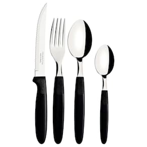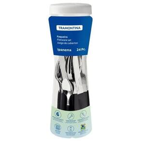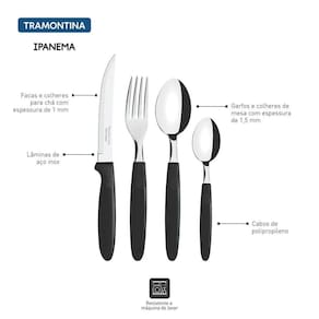 - Marca: Tramontina; - Lâminas de aço inox; - As lâminas das facas têm maior durabilidade do fio devido ao tratamento térmico; - Os garfos e colheres garantem maior resistência devido a espessura do aço e a estampagem das lâminas; - Os cabos de polipropileno possuem maior resistência e durabilidade; - Podem ir à máquina de lavar louças facilitando seu dia a dia; - Garantia: 3 meses.
