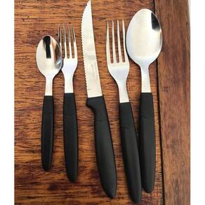Contém: 6 - Facas para churrasco 5'' 6 - Garfos de mesa 6 - Colheres de mesa 6 - Garfos de sobremesa 6 - Colheres para chá.