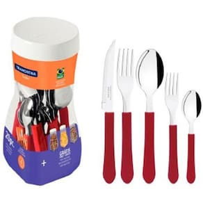 BELA HOME CENTER ››› Faqueiro Tramontina Leme com Lâminas em Aço Inox e Cabos de Polipropileno Vermelho 20 Peças ‹‹‹ › O Faqueiro Tramontina Leme com Lâminas em Aço Inox e Cabos de Polipropileno Vermelho 20 Peças é a escolha certa para deixar suas refeições muito mais práticas e cheias de estilo! As peças que compõem o jogo são produzidas com lâminas em aço inox e cabos de polipropileno que contam com resistência e durabilidade para estarem presentes em todos os momentos do seu dia. Sua utilização é muito agradável e você garante um manuseio seguro, pois seus cabos tem formato anatômico e encaixam-se perfeitamente a sua mão. As peças ainda são fáceis de limpar e podem ir à máquina de lavar louças, facilitando seu dia a dia na cozinha! • INFORMAÇÕES GERAIS › Lâminas de aço inox.- As lâminas das facas têm maior durabilidade do fio devido ao tratamento térmico.- Os garfos e colheres garantem maior resistência devido a espessura do aço e a estampagem das lâminas.- Os cabos de polipropileno possuem maior resistência e durabilidade.- Podem ir à máquina de lavar louças facilitando seu dia a dia. • RECOMENDAÇÕES DE USO - Antes da primeira utilização, lave bem as peças e seque-as.- Tenha cuidado ao manusear produtos cortantes e perfurantes e mantenha-os fora do alcance das crianças.- Para maior durabilidade dos produtos recomenda-se secar bem antes de guardar, mesmo após lavagem em máquina.- Para descarte dos produtos e embalagens siga as orientações de reciclagem vigentes. • ITENS INCLUSOS › 4 Facas para Churrasco 4" Leme - C: 2022cm - L: 1.8cm- A: 0,9cm › 4 Garfos de Mesa Leme- C: 18.5cm- L: 2.3cm- A: 1.3cm › 4 Colheres de Mesa Leme- C: 18.6cm- L: 3.9cm- A: 1.5cm › Garfo para Sobremesa Leme- C: 16.4cm- L: 2.0cm- A: 1.1cm › Colher para Chá Leme- C: 13.7cm- L: 2.5cm- A: 1.1cm ›››› IMAGENS MERAMENTE ILUSTRATIVAS ‹‹‹‹