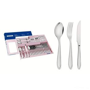 Peças totalmente feitas de aço inox, altamente duráveis, mantêm suas características , preservando a beleza, a higiene e a durabilidade do material. Colheres com bojo em formato simétrico e bordas cuidadosamente arredondadas. Garfos com dentes polidos na parte interna, com formato apropriado para a boca e bordas arredondadas para proporcionar maior conforto no . Facas totalmente temperadas, que garantem maior durabilidade no fio de corte e maior resistência à corrosão, e por suas características de temperabilidade, não riscam as porcelanas. Acabamento em brilho, com detalhes no cabo. Próprias para diário combinam com qualquer ambiente. Podem ser lavadas diariamente na máquina de lavar louças.