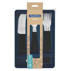 Com o Faqueiro Tramontina Leme com Lâminas em Aço Inox e Cabos de Polipropileno Preto com Gaveteiro 25 peças você irá garantir uma mesa muito mais bonita e refeições muito mais saborosas. Suas peças tem lâminas produzidas em aço inox e contam com cabos desenvolvidos em polipropileno, ambas características que proporcionam maior durabilidade e resistência. Ele vem na cor preta e deixa sua mesa muito mais moderna. É ainda muito fácil de limpar e pode ser lavado na máquina de lavar louças, além de acompanhar gaveteiro plástico ideal para armazená-lo e guardá-lo em sua gaveta. A escolha perfeita para o seu dia a dia Contém: 6 facas para Churrasco 4 6 Garfos de Mesa 6 Colheres de Mesa 6 Colheres para Chá 1 Gaveteiro Importante: Lâminas de aço inox. As lâminas das facas têm maior durabilidade do fio devido ao tratamento térmico. Os garfos e colheres garantem maior resistência devido a espessura do aço e a estampagem das lâminas. Os cabos de polipropileno possuem maior resistência e durabilidade. Gaveteiro ideal para armazenar e guardar os talheres na gaveta. Podem ir à máquina de lavar louças facilitando seu dia a dia. Tenha cuidado ao manusear produtos cortantes e perfurantes e mantenha-os fora do alcance das crianças. Para maior durabilidade dos produtos recomenda-se secar bem antes de guardar, mesmo após lavagem em máquina.