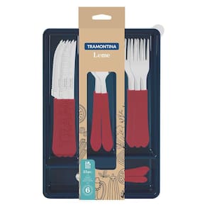 Se você gosta de compor mesas vibrantes e refeições convidativas, precisa utilizar o Faqueiro Tramontina Leme com Lâminas em Aço Inox e Cabos de Polipropileno Vermelho com Gaveteiro 25 peças Com peças resistentes e duráveis, ele é perfeito para ser utilizado no dia a dia, pois suas peças são produzidas com lâminas de aço inox e cabos em polipropileno. Ele vem na cor vermelho e garante uma mesa colorida e cheia de personalidade. Além disso, o faqueiro é ainda muito fácil de limpar e pode ir à máquina de lavar louças, levando facilidade e praticidade para o seu dia a dia. Ele também acompanha gaveteiro plástico, perfeito para armazenar e guardar suas peças. Contém: 6 facas para Churrasco 4 6 Garfos de Mesa 6 Colheres de Mesa 6 Colheres para Chá 1 Gaveteiro Importante: Lâminas de aço inox. As lâminas das facas têm maior durabilidade do fio devido ao tratamento térmico. Os garfos e colheres garantem maior resistência devido a espessura do aço e a estampagem das lâminas. Os cabos de polipropileno possuem maior resistência e durabilidade. Gaveteiro ideal para armazenar e guardar os talheres na gaveta. Podem ir à máquina de lavar louças facilitando seu dia a dia. Tenha cuidado ao manusear produtos cortantes e perfurantes e mantenha-os fora do alcance das crianças. Para maior durabilidade dos produtos recomenda-se secar bem antes de guardar, mesmo após lavagem em máquina.