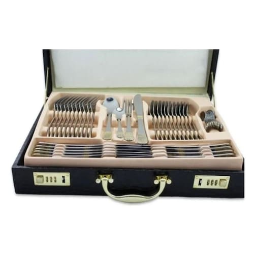 Faqueiro Luxuoso Inox 84 Peças Banhando A Ouro 24K Faqueiro Inox Luxo 84 Peças Dourado com Maleta Peças em Aço Inoxidável 18/10 3.0mm de espessura com filetes dourados, design exclusivo e sofisticado Faqueiro leva charme, elegância e bom gosto para a composição da sua mesa. Um faqueiro clássico produzido em aço inox, ricamente adornado e exclusivo. Todas as peças são produzidas em aço inoxidável. Apresentam espessura de 3mm e acabamento espelhado. Caixa produzida no estilo maleta reforçada com fechamento em sistema de código. 01 Maleta com:12 Colheres12 Garfos principais12 Facas principais12 colheres chá/sobremesa12 Garfos sobremesa01 Espátula pata bolo02 Garfos peixe01 Concha grande01 Concha pequena01 Colher açucareiro01 Pegador02 Colheres para servir02 Colheres de salada 1 ano. Marca: Não Informado