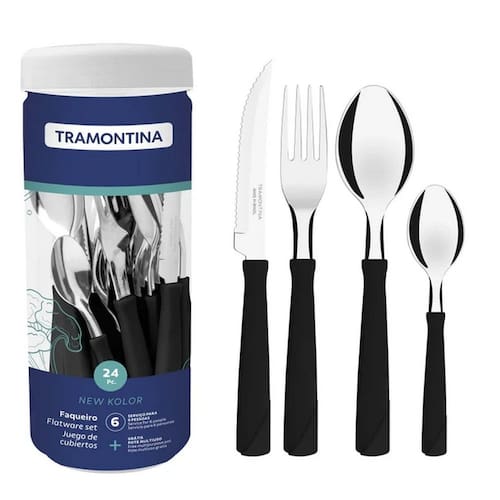 Com 24 peças, ele possui lâminas em aço inox e cabos de polipropileno na cor preta. Suas lâminas em aço inox garantem resistência e durabilidade, enquanto as facas temperadas proporcionam cortes precisos e de longa duração. Os cabos de polipropileno possuem design ergonômico, assegurando conforto e segurança durante o uso. Fácil de limpar e compatível com lava-louças, é a combinação perfeita de praticidade e estilo para suas refeições diárias!