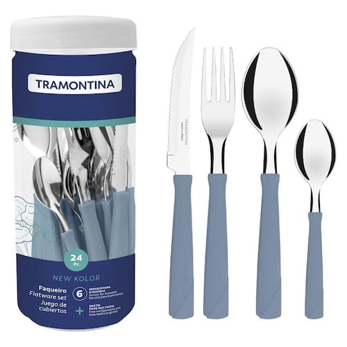 Garanta praticidade e estilo às suas refeições com o Faqueiro New Kolor Tramontina Azul com 24 Peças com lâminas em aço inox e cabos de polipropileno azul.