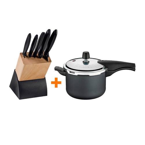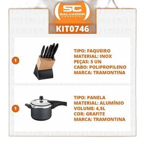 OBS: Veja na descrição os itens que acompanham o jogo.COMPONENTES DO KIT:1 - Jogo de 6 PÇ 4 facas, 1 garfo e Suporte de Madeira Plenus - Tramontina 234980281 - Panela Pressão 4,5 Lts antiaderente Tramontina VancouverJogo de 6 PÇ 5 pç e Suporte de Madeira Plenus Lâminas Inox Cabos Polipropileno - Tramontina 23498028- Cor do cabo: Preto- Material do cabo: Polipropileno- Peso Líquido: 1,1 kg.- Peso Bruto: 1,3 kg.- Dimensões Produto: 30cm A x 12cm L x 21cm C.- Dimensões Embalagem 31cm A x 13cm L x 22cm C.- Conteúdo do jogo:1 - 29900500 - Base de Madeira 1 - 23426007 - Faca Chef Lâmina 7 17,78cm 1 - 23425005 - Faca Desossar Lâmina 5 12,7cm 1 - 23420003 - Faca para Legumes e FrutasLâmina 3 7,62cm 1 - 23428005 - Faca para Tomates Lâmina 5 12,7cm 1 - 23432000 - Garfo TrinchantePanela Pressão 4,5 Lts antiaderente Tramontina Vancouver- NÃO indicado para fogão Indução.Característica e Descrição Ficha Técnica:- Modelo Vancouver Starfloncód. 20582/620 Grafite- Eficiente e Segura.- Produzida em alumínio com revestimento interno e externo em antiaderente Starflon T1- Tampa em aluminio com acabamento externo polido e interno satinado tampa não é antiaderente .- Alças e cabo superior e inferior em baquelite.- Sitema de segurança lateral.- Válvula de segurança.- Válvula de trabalho alívio .- Revestimento antiaderente StarFlon.- Maior resistência á desgaste por fricção, raspagem.- Pode cozinhar fogão gás, elétrico e também vitrocerâmico.- Fácil manuseio e limpeza.- Capacidade 4,5L.- 1 Unidade por embalagem.- 3 sistema de segurança 1 cabo e 2 na tampa. - Peso Líquido: 1,6 Kg- Peso Bruto: 1,75 Kg- Medidas internas panela : 19,5cm diâmetro x 14,5 Alt. verifique o nivel máxima informado no interior panela - Medida Externa: 22,9cm A x 40,8cm L x 23,1 P - mais detalhes, na foto do anuncio .- Medida Embalagem: 21 cm Alt x 39cm L x 23cm P. Marca: Não Informado Ean: 7890100014808