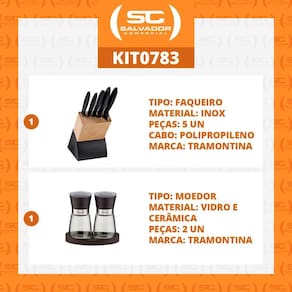 COMPONENTES DO KIT:1 - Jogo de 6 PÇ 4 facas, 1 garfo e Suporte de Madeira Plenus - Tramontina 234980281 - Jogo Moedor de Sal e Pimenta em Cerâmica e Vidro com Base em Silicone Linha Churrasco - Tramontina 26499042Jogo de 6 PÇ 5 pç e Suporte de Madeira Plenus Lâminas Inox Cabos Polipropileno - Tramontina 23498028- Cor do cabo: Preto- Material do cabo: Polipropileno- Peso Líquido: 1,1 kg.- Peso Bruto: 1,3 kg.- Dimensões Produto: 30cm A x 12cm L x 21cm C.- Dimensões Embalagem 31cm A x 13cm L x 22cm C.- Conteúdo do jogo:1 - 29900500 - Base de Madeira1 - 23426007 - Faca Chef Lâmina 7 17,78cm 1 - 23425005 - Faca Desossar Lâmina 5 12,7cm 1 - 23420003 - Faca para Legumes e FrutasLâmina 3 7,62cm 1 - 23428005 - Faca para Tomates Lâmina 5 12,7cm 1 - 23432000 - Garfo TrinchanteJogo Moedor de Sal e Pimenta em Cerâmica e Vidro com Base em Silicone Linha Churrasco - Tramontina 26499042Garantia: 90 dias para vícios ou defeitos de fabricação.- Moedores de cerâmica com regulador de tamanho de grão, para que seja ajustado conforme o seu gosto.- Recipientes de vidro e tampas de plástico.- Base de silicone.- Capacidade de 200 g para sal e 100 g para pimenta.- EAN13: 7891112186897- DUN14: 17891112186894- NCM: 7013.49.00- Peso Líquido: 0,5900 kg.- Peso Bruto: 0,7100 kg.- Medidas Produto: 13cm A x 6,5cm diâmetro- Dimensões Embalagem: 11cm A x 23cm L x 21cm C. Marca: Não Informado