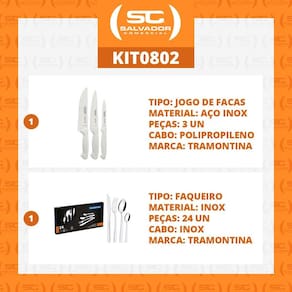 OBS: Veja na descrição os itens que acompanham o jogo. COMPONENTES DO KIT: 1 - Jogo de Faca Premium 3 PÇ - Tramontina 24499811 1 - Faqueiro Facas Talheres Búzios 24pç Tramontina 23799/071 Jogo de Facas Premium com Lâminas em Aço Inox e Cabos de Polipropileno Branco 3 Peças - Tramontina 24499811 : 90 dias para vícios ou defeitos de fabricação. As lâminas de aço inox tem maior durabilidade do fio devido ao tratamento térmico. Os cabos de polipropileno possuem maior resistência e durabilidade. Podem ir à máquina de lavar louças facilitando seu dia a dia. - Cor do cabo: Branco - Material do cabo: Polipropileno - Peso Líquido: 0,20 kg. - Peso Bruto: 0,25 kg. - Medidas Embalagem: 2,0cm A x 16cm L x 38cm C - Conteúdo do jogo: 1 - 24472186 - Faca Utility Lâmina 6 15,24cm 1 - 24473187 - Faca para Cozinha lâmina 7 17,78cm 1 - 24470184 - Faca para Frutas e Legumes Lâmina 4 10,16cm Faqueiro Facas Talheres Búzios 24pç Tramontina 23799/071 Faca e Garfo. Característica e Descrição Ficha Técnica: - Modelo Búzios 24 peças. Cód. 23799/071 Inox. Uso Seguro e Adequado: - Antes da primeira utilização, lave bem as peças e seque-as. - Produto cortantes e perfurantes, tenha cuidado e mantenha sempre fora de alcance das crianças. - Para maior durabilidade dos produtos, recomenda-se secar bem antes de guardar, mesmo após lavagem em máquinas. - Para descarte dos produtos e embalagem, sega as orientações de reciclagem vigente. Conteúdo: - 6 Faca Churrasco Lâmina serrilhada 10,6cm - medida total 20,8cm - 6 Garfos de mesa - medida total 19cm - 6 Colheres de mesa - medida total 19cm - 6 Colheres para chá - medida total 13cm - Lâmina em aço inox ,maior resistência á desgaste por fricção, raspagem. - Fácil manuseio e limpeza sempre cuidando com navalha e pontas . - 24 pç por embalagem. - Peso Líquido: 0,8 Kg - Peso Bruto: 0,95 Kg - Medida Embalagem: 4cm A x 45cm L x 21cm P. Marca: Não Informado
