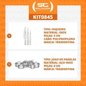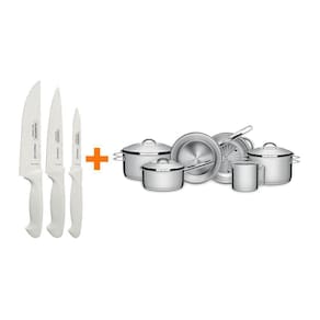 OBS: Veja na descrição os itens que acompanham o jogo.COMPONENTES DO KIT:1 - Jogo de Faca Premium 3 PÇ - Tramontina 244998111 - Jogo de Panelas com Fundo Triplo Corpo e Tampa em Inox 6 pçs - Solar - Tramontina Cód. 65510200jogo de Facas Premium com Lâminas em Aço Inox e Cabos de Polipropileno Branco 3 Peças - Tramontina 24499811Garantia: 90 dias para vícios ou defeitos de fabricação.As lâminas de aço inox tem maior durabilidade do fio devido ao tratamento térmico.Os cabos de polipropileno possuem maior resistência e durabilidade.Podem ir à máquina de lavar louças facilitando seu dia a dia.- Cor do cabo: Branco- Material do cabo: Polipropileno- Peso Líquido: 0,20 kg.- Peso Bruto: 0,25 kg.- Medidas Embalagem: 2,0cm A x 16cm L x 38cm C- Conteúdo do jogo:1 - 24472186 - Faca Utility Lâmina 6 (15,24cm)1 - 24473187 - Faca para Cozinha lâmina 7 (17,78cm)1 - 24470184 - Faca para Frutas e Legumes Lâmina 4 (10,16cm)Jogo de Panelas com Fundo Triplo Corpo e Tampa em Inox 6 pçs - Solar - Tramontina Cód. 655102001 un - Panela 1,4 litro Solar11,3cm A x 18cm L x 33,3cm P Diâmetro: 16cm Ref. 625011601 un - Caçarola rasa 4,7l litros Solar 16,5cm A x 26,3cm L x 33cm P Diâmetro: 24cm Ref. 625032401 un - Caçarola funda 3,6l litros Solar 16,8cm A x 22,1cm L x 27,5cm P Diâmetro: 20cm Ref. 625042001 un - Cozi-vapore 3,2 litros Solar 10,5cm A x 22,1cm L x 27,6cm P Diâmetro: 20cm Ref. 625102001 un - Frigideira s/ tampa 2,20 litros Allegra 8,1cm A x 22,2cm L x 39,6cm P Diâmetro: 20cm Ref. 626502001 un - Fervedor 1,40 litro Allegra Não recomenda-se uso em fogão de indução. 13,1cm A x 13,1cm L x 17,2cm P Diâmetro: 12cmRef. 62664120- Material: aço inox- Tampas com encaixe perfeito e saída de vapor- Fundo triplo: aço inox + alumínio + aço inox)- Cozimento rápido com distribuição de calor uniforme- Economia de tempo e energia- As alças de inox aquecem durante o cozimento. Aconselhamos o uso de luvas durante o manuseio.- Pode ir ao forno em temperatura MÁXIMA de 260C- Capacidade volumétrica máxima de cozimento é 3/4 da capacidade total da peçaPeso líquido do conjunto: 5,80 kgPeso bruto do conjunto: 6,70 kgMedidas da embalagem:23cm A x 29cm L x 56,5cm P.