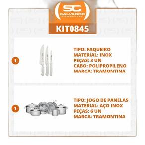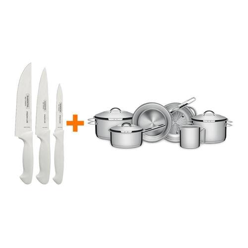 OBS: Veja na descrição os itens que acompanham o jogo.COMPONENTES DO KIT:1 - Jogo de Faca Premium 3 PÇ - Tramontina 244998111 - Jogo de Panelas com Fundo Triplo Corpo e Tampa em Inox 6 pçs - Solar - Tramontina Cód. 65510200jogo de Facas Premium com Lâminas em Aço Inox e Cabos de Polipropileno Branco 3 Peças - Tramontina 24499811Garantia: 90 dias para vícios ou defeitos de fabricação.As lâminas de aço inox tem maior durabilidade do fio devido ao tratamento térmico.Os cabos de polipropileno possuem maior resistência e durabilidade.Podem ir à máquina de lavar louças facilitando seu dia a dia.- Cor do cabo: Branco- Material do cabo: Polipropileno- Peso Líquido: 0,20 kg.- Peso Bruto: 0,25 kg.- Medidas Embalagem: 2,0cm A x 16cm L x 38cm C- Conteúdo do jogo:1 - 24472186 - Faca Utility Lâmina 6 15,24cm 1 - 24473187 - Faca para Cozinha lâmina 7 17,78cm 1 - 24470184 - Faca para Frutas e Legumes Lâmina 4 10,16cm Jogo de Panelas com Fundo Triplo Corpo e Tampa em Inox 6 pçs - Solar - Tramontina Cód. 655102001 un - Panela 1,4 litro Solar11,3cm A x 18cm L x 33,3cm P Diâmetro: 16cm Ref. 625011601 un - Caçarola rasa 4,7l litros Solar 16,5cm A x 26,3cm L x 33cm P Diâmetro: 24cm Ref. 625032401 un - Caçarola funda 3,6l litros Solar 16,8cm A x 22,1cm L x 27,5cm P Diâmetro: 20cm Ref. 625042001 un - Cozi-vapore 3,2 litros Solar 10,5cm A x 22,1cm L x 27,6cm P Diâmetro: 20cm Ref. 625102001 un - Frigideira s/ tampa 2,20 litros Allegra 8,1cm A x 22,2cm L x 39,6cm P Diâmetro: 20cm Ref. 626502001 un - Fervedor 1,40 litro Allegra Não recomenda-se uso em fogão de indução. 13,1cm A x 13,1cm L x 17,2cm P Diâmetro: 12cmRef. 62664120- Material: aço inox- Tampas com encaixe perfeito e saída de vapor- Fundo triplo: aço inox + alumínio + aço inox - Cozimento rápido com distribuição de calor uniforme- Economia de tempo e energia- As alças de inox aquecem durante o cozimento. Aconselhamos o uso de luvas durante o manuseio.- Pode ir ao forno em temperatura MÁXIMA de 260C- Capacidade volumétrica máxima de cozimento é 3/4 da capacidade total da peçaPeso líquido do conjunto: 5,80 kgPeso bruto do conjunto: 6,70 kgMedidas da embalagem:23cm A x 29cm L x 56,5cm P.