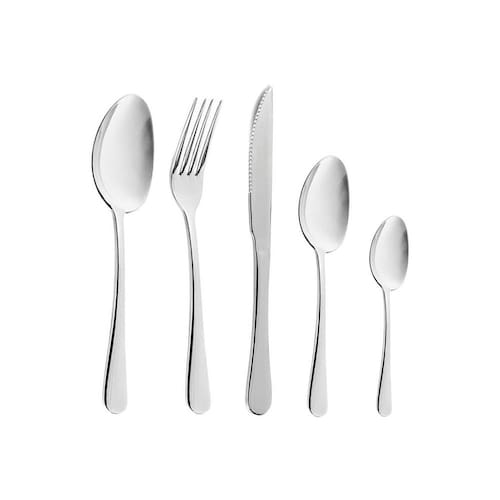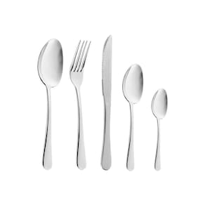 Contem: 6 Garfos de Mesa Medidas: 20 x 2,5 x 0,25 cm 6 Colheres de Mesa Medidas: 20 x 4,2 x 0,25 cm 6 Facas de Mesa Serrilhada Medidas: 23 x 2 x 0,4 cm 6 Colheres de Cha Medidas: 14 x 3 x 0,15 cm 6 Colheres de Sobremesa Medidas: 18 x 4 x 0,25 cm Material: Aço Inoxidavel Pode ser levado a maquina de lavar louças