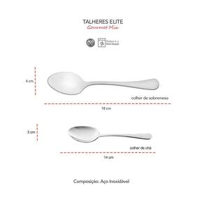 Faqueiro com talheres de mesa e sobremesa em aço inoxidavel. A linha de Talheres Elite da Gourmet Mix possui design atual, com linhas arredondadas sem detalhes nos cabos, com maior espessura e acabamento em alto brilho, o que da aos talheres uma aparencia leve e sofisticada. Sao produzidos totalmente em aço inox de qualidade, garantindo a durabilidade, beleza e higiene.
