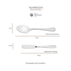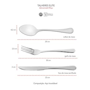 Faqueiro com talheres de mesa e sobremesa em aço inoxidavel. A linha de Talheres Elite da Gourmet Mix possui design atual, com linhas arredondadas sem detalhes nos cabos, com maior espessura e acabamento em alto brilho, o que da aos talheres uma aparencia leve e sofisticada. Sao produzidos totalmente em aço inox de qualidade, garantindo a durabilidade, beleza e higiene.