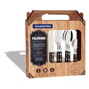 Faqueiro Tramontina Aço Inox Polywood Castanho 24 Peças Talheres de qualidade deixam sua mesa muito mais convidativa. Um exemplo é a linha Polywood Castanho que, com seus cabos de madeira tratada, faz bonito em encontros mais informais. Recomendações de Uso: Antes do uso: Antes de utilizar o , remova as eventuais etiquetas e lave-o com água e de uso: Durante a lavagem use somente esponja macia, outros tipos de produtos, como palha de aço, poderão riscar ou prejudicar o brilho do aço inox. Enxágue bem a peça a fim de remover totalmente os resíduos dos produtos de limpeza, que por serem abrasivos, podem danificar o inox. Após a lavagem enxugue a peça, pois as substâncias químicas contidas na água poderão causar manchas. Sempre que possível use água quente, pois renova o brilho do talher. Evite o das peças com superfícies quentes, pois podem provocar a descoloração do produto. Quando usar a máquina de lavar louça, recomendamos retirar o talher logo que tenha terminado o ciclo enxaguar, a fim de que os mesmos sejam secados manualmente.- Foto meramente ilustrativa. Informações Adicionais: