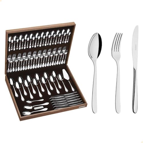 O conjunto inclui 76 peças em aço inox, acondicionadas em um belo estojo de madeira MDF, com colheres, garfos e facas cuidadosamente projetados para conforto e sofisticação à mesa. Cor: Cinza | Quantidade de peças: 76 | É kit de : Sim | EmbalagemAltura-cm: 10 | EmbalagemLargura-cm: 58 | EmbalagemComprimento-cm: 46 | Marca: Tramontina | Modelo: Cannes | Dias Fornecedor: 0 | Peso Líquido: 0.0000 | Cubagem: 0.026680