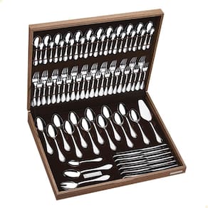 Faqueiro Tramontina Cannes em Aço Inox com Facas de Mesa Forjadas Acabamento Alto Brilho e Estojo de Madeira 76 Peças 66979300