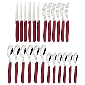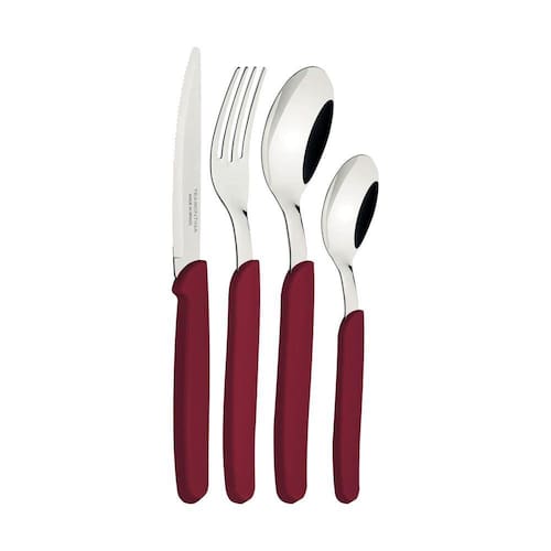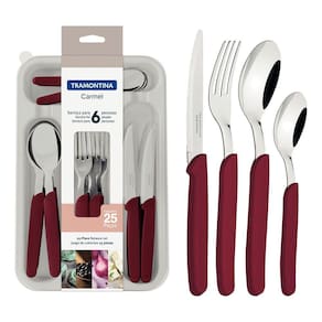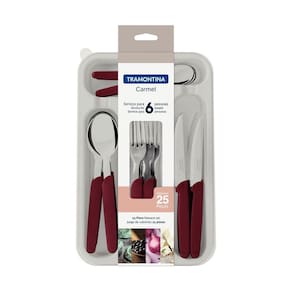 Faqueiro Tramontina Carmel com Lâminas em Aço Inox e Cabos de Polipropileno Carmim Escuro 25 Peças O faqueiro Tramontina Carmel com lâminas em aço inox e cabos de polipropileno carmim escuro 25 peças é a escolha ideal para deixar sua mesa muito mais moderna, cheia de estilo e atraente. Composto por peças com lâminas em aço inox e cabos de polipropileno, ele é um faqueiro que garante resistência e durabilidade, pois suas facas tem tratamento térmico e os garfos e as facas estampagem e espessura especial do aço. Para maior praticidade na cozinha, ele pode ser levado à máquina de lavar louças e conta com um gaveteiro perfeito para guardar os talheres! Lâminas de aço inox. Lâminas das facas com maior durabilidade do fio devido ao tratamento térmico. Garfos e colheres que garantem maior resistência devido a espessura do aço e a estampagem das lâminas. Cabos de polipropileno com maior resistência e durabilidade. Gaveteiro de polipropileno. Use na gaveta ou direto na mesa. Podem ir à máquina de lavar louças facilitando seu dia a dia. Cuidados com o produto Antes da primeira utilização, lave bem as peças e seque-as. Tenha cuidado ao manusear produtos cortantes e perfurantes e mantenha-os fora do alcance das crianças. Para maior durabilidade dos produtos recomenda-se secar bem antes de guardar, mesmo após lavagem em máquina. Para descarte dos produtos e embalagem siga as orientações de reciclagem vigentes. Garanti 90 dias para vícios ou defeitos de fabricação.