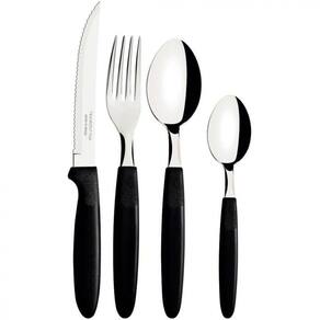 Caracteristicas: Lâminas de aço inox As lâminas das facas têm maior durabilidade do fio devido ao tratamento térmico Os garfos e colheres garantem maior resistência devido a espessura do aço e a estampagem das lâminas Os cabos de polipropileno possuem maior resistência e durabilidade Podem ir à máquina de lavar louças facilitando seu dia a dia