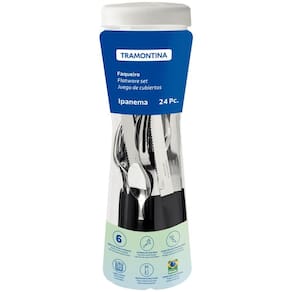 Quer uma solução prática para ter o talher certo para as mais diferentes refeições? Então conheça o faqueiro Tramontina Ipanema preto com pote plástico 24 peças. Um faqueiro com garfos, facas e colheres para servir da entrada à sobremesa, que tem peças produzidas com lâminas em aço inox com espessura e formatos diferenciados que garantem maior durabilidade e resistência. Os cabos são produzidos em polipropileno e garantem maior conforto no manuseio, além de deixar sua mesa muito mais moderna, devido a cor preta. O faqueiro Ipanema ainda acompanha um pote plástico, perfeito para armazenar suas peças ou alimentos como macarrão ou outros grãos. Com certeza, a escolha ideal para sua cozinha!